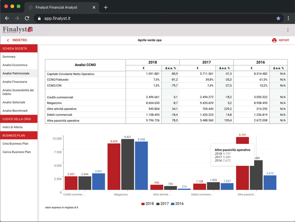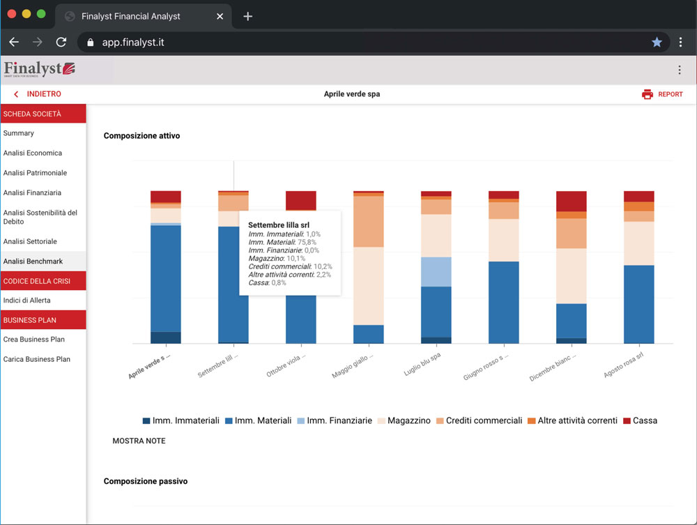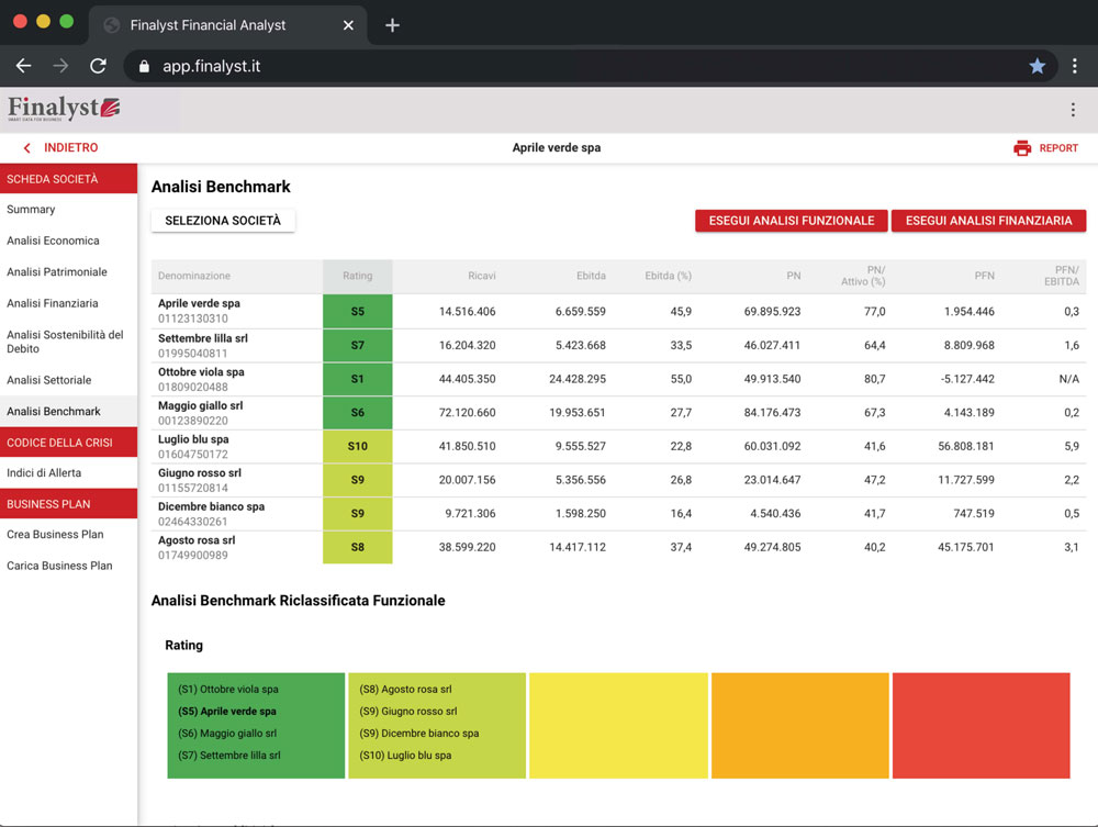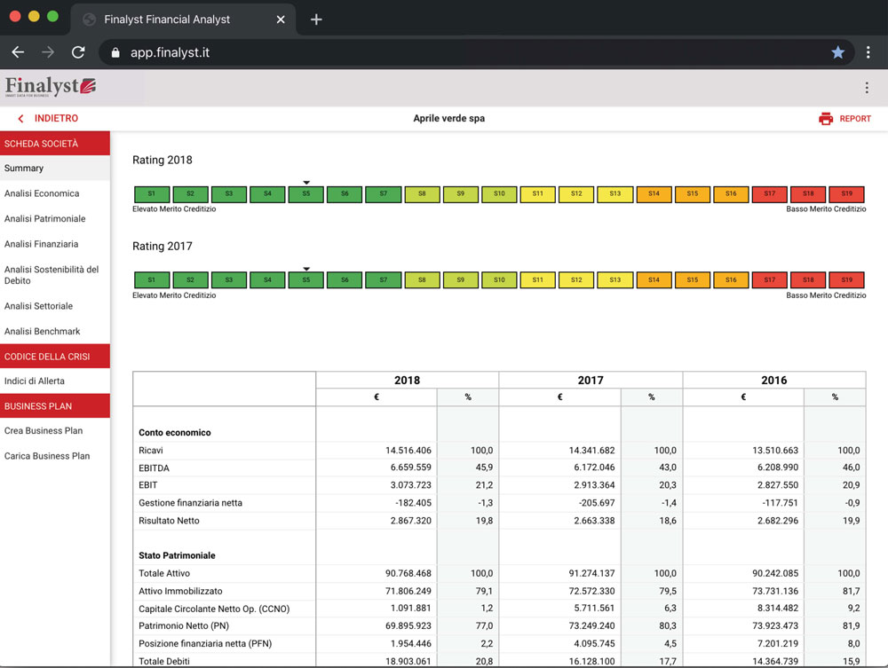Il software fornisce un supporto quotidiano e strategico all’azienda e al suo consulente, fornendo analisi rapide e senza errori, che consentono di valutare la solidità dei propri clienti, il posizionamento dei competitor e le caratteristiche del settore; può, inoltre, creare velocemente un report per banche, advisor ed investitori.