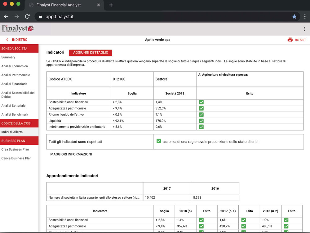 Oltre all’analisi degli indici di bilancio e dei margini di bilancio, mette a disposizione molteplici funzionalità tra cui elaborazione del rating, costruzione benchmark personalizzati rispetto ai competitor, elaborazione budget di tesoreria a breve o pluriennali. Inoltre, coerentemente con il Nuovo Codice della Crisi e dell’Insolvenza, verifica il rispetto degli Indici di Allerta.