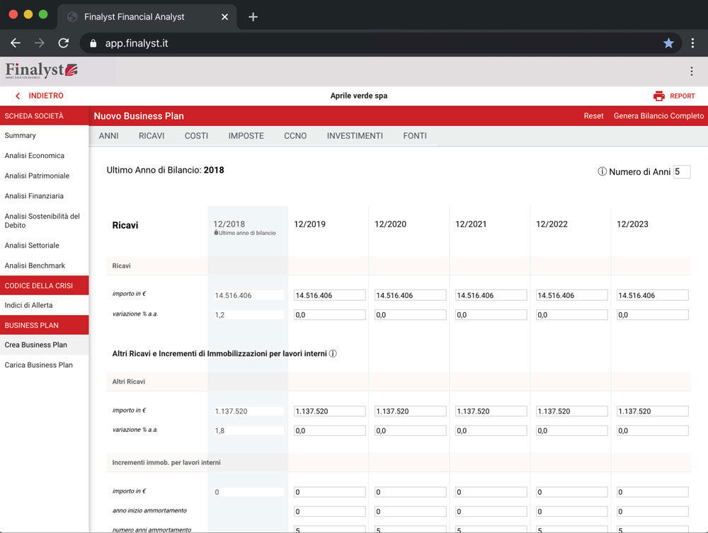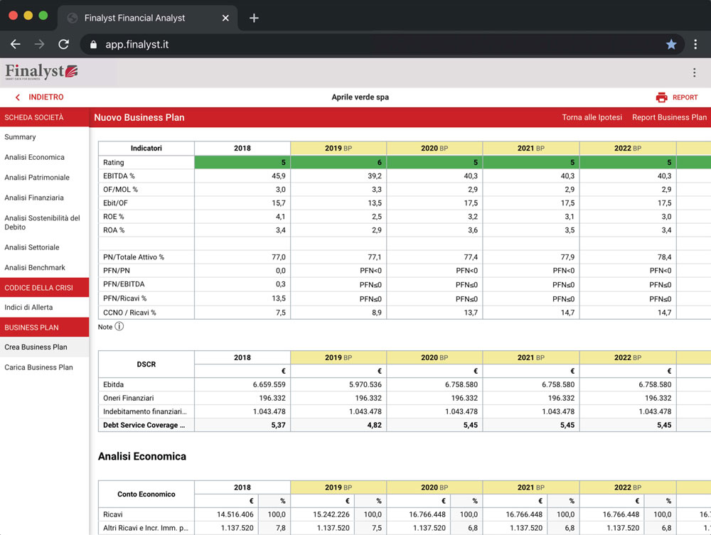 da 1 a 5 anni completo di riclassificati, indici e DSCR con ipotesi preimpostate modificabili, che permettono di realizzare anche analisi di scenario in pochi passaggi. Scegli Finalyst Analisi Finanziaria come software per lo sviluppo di business plan.